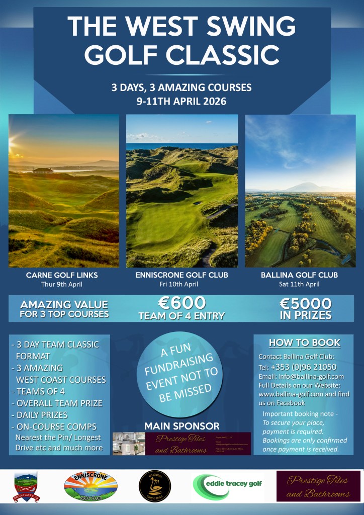 - The West Swing Golf Classic will be held on April 09, 10 & 11 in Carne, Enniscrone and Ballina Golf Clubs respectively.